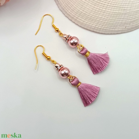 Arany akasztós fülbevaló – rózsaarany hematit gyönggyel, mályva bojttal