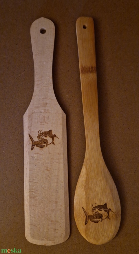 A minta pirográf technikával készült, amely időtálló és tulajdonosa így bátran használhatja sütés és főzés közben a fakanalakat.