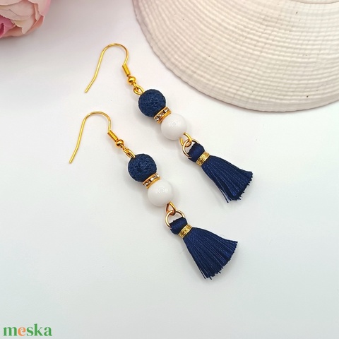 Arany akasztós fülbevaló – achát és sötétkék lávagyönggyel, sötétkék bojttal
