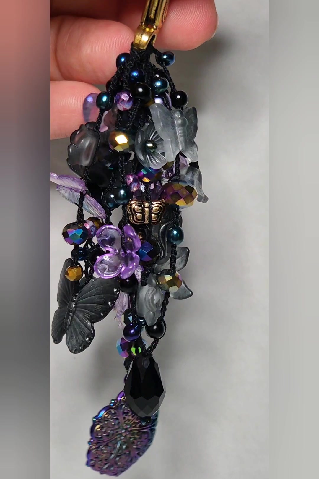 Fekete, lila irizáló színű, táskaékszer, táskadísz, mandala dísszel.