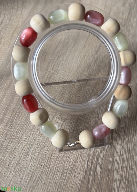 - Anyaga: fa gyöngy, poliészter fonal, macskaszem gyöngy
