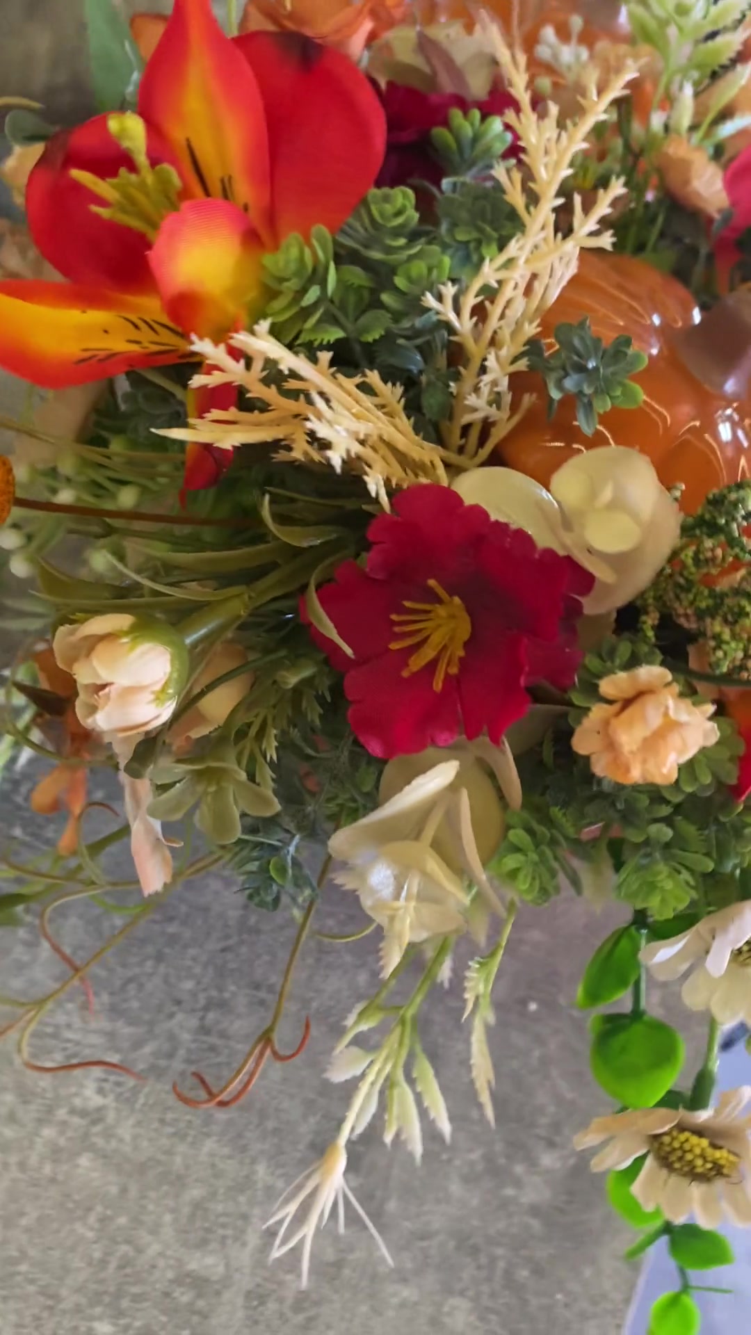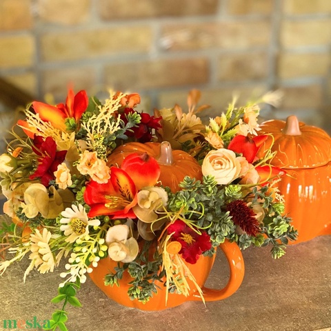 Kerámia tökös pohárba selyemvirágokkal díszített őszi asztaldísz
