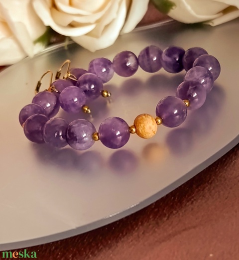Ametiszt ásványkarkötő illatos Palo Santoval és fülbevalóval