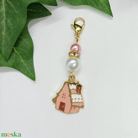 Rózsaszín színű házikó medálos kulcstartó, táskadísz