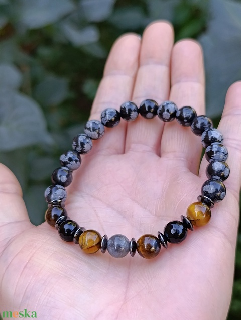 Hópehely obszidián, tigrisszem, fekete obszidián és labradorit férfi ásványkarkötő