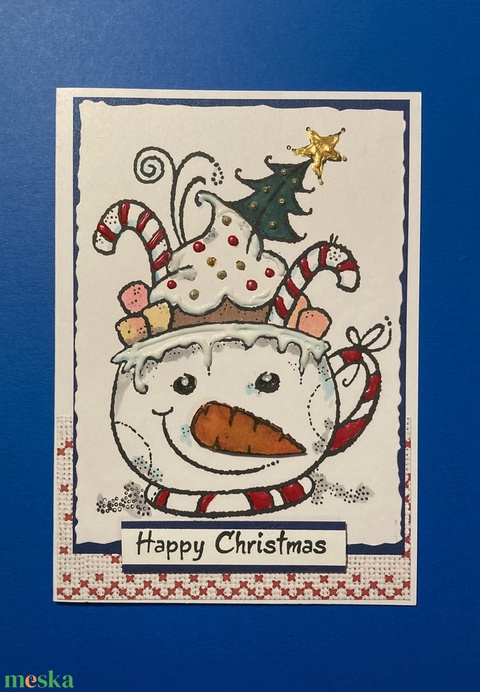 Hóember csészés karácsonyi képeslap, ajándékkísérő, üdvözlőlap