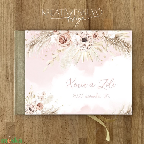 Pasztell virágos, pampa füves esküvői vendégkönyv, fotókönyv