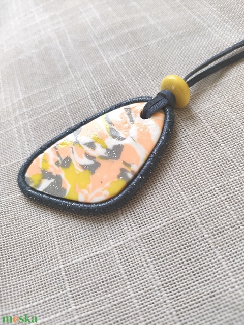 - Anyaga: ékszergyurma, bőr szíj, fa gyöngy