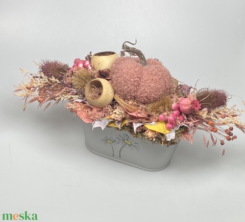 Tökös-zabos - őszi hangulatú, pasztell színvilágú tartós asztaldísz margarétás virágtálban, mályva zsenília tökkel
