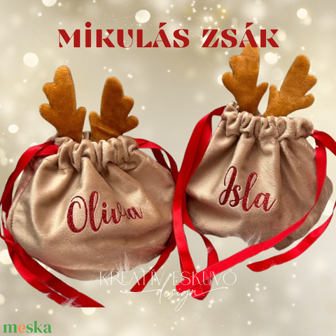Bársony rénszarvasos mikulás zsák - névre szóló, feliratozott, neves
