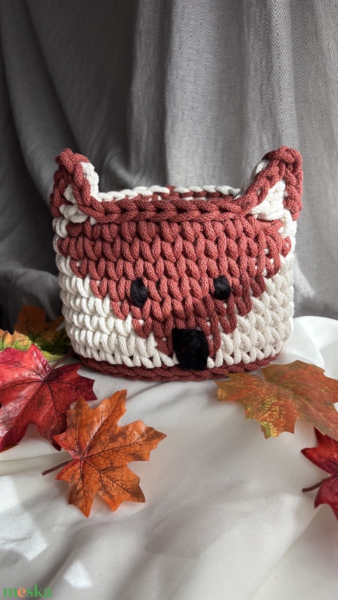 Rókás horgolt tároló, kosár tégla bordó és ekrü színben, horgolt állatos tároló