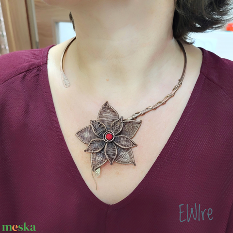 Vörösréz nyakèk, merev réz nyaklánc virág mintával