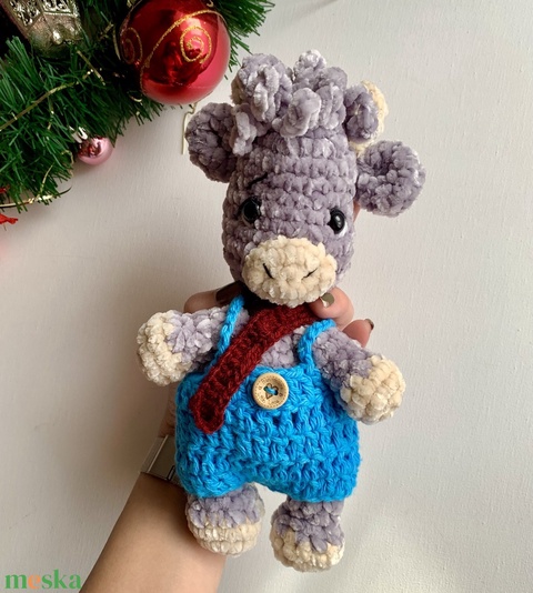 - Anyaga: bársony hatású zsenília fonal, fa gomb, biztonsági szem, antiallergén poliészter töltőanyag, 50% pamut 50% akril fonal
