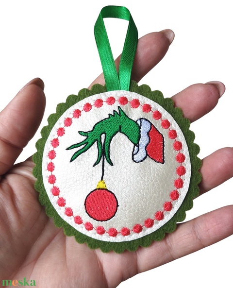 GRINCS Dekoratív hímzett kézműves karácsonyfadísz - Grincs kéz pezsgő-zöld