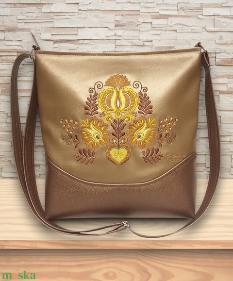Melanie hímzett pakolós válltáska oldaltáska - Hungarian Extra 002 bronz óarany alapon textilbőr vállpánttal