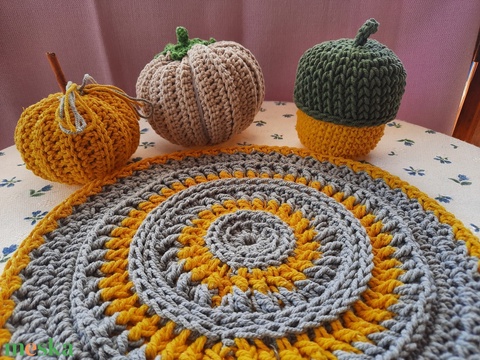 Horgolt őszi dekor szett: asztali alátét, makk tároló, töldísz.