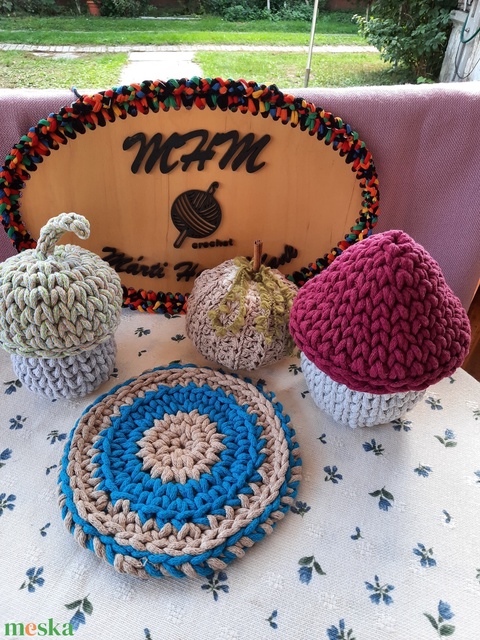 Horgolt őszi dekor szett: asztali alátét, makk tároló, töldísz.