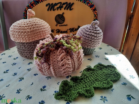 Horgolt őszi dekor szett: asztali alátét, makk tároló, töldísz.