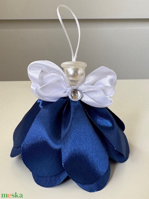 Selyemszalagból gondosan kézzel készített angyalka mely akasztóval rendelkezik. Karácsonyfa dísznek is tökéletes. Az angyalka méretei: magasság: kb. 8-9 cm, szélesség: kb. 8-9 cm