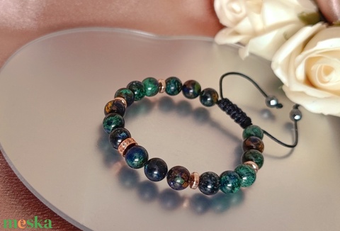 Az azurit mély kékje a bölcsességet, a tisztánlátást és az intuíciót hordozza, míg a malachit zöldje a szív gyógyulását, az átalakulást és a változás elfogadását segíti. Együtt olyanok, mintha az ég és a föld találkozna benned: a szellemi tisztaság és a lelki gyógyulás kéz a kézben járnak.