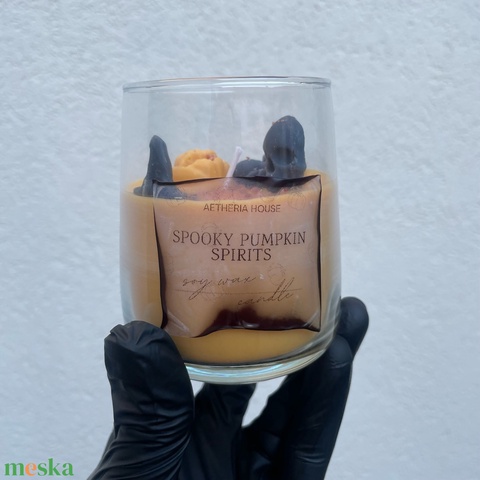 Pumpkin Spirits – nagy Halloween szójagyertya tök színben, kézműves gyertya szellemes díszítéssel – őszi lakásdekoráció