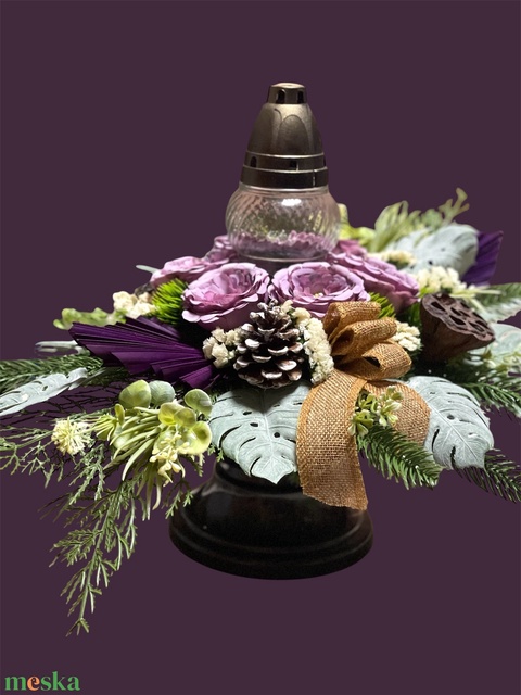 - Anyaga: műanyag alj, selyemvirág, szalag, mécses, gyertya, száraz termés
