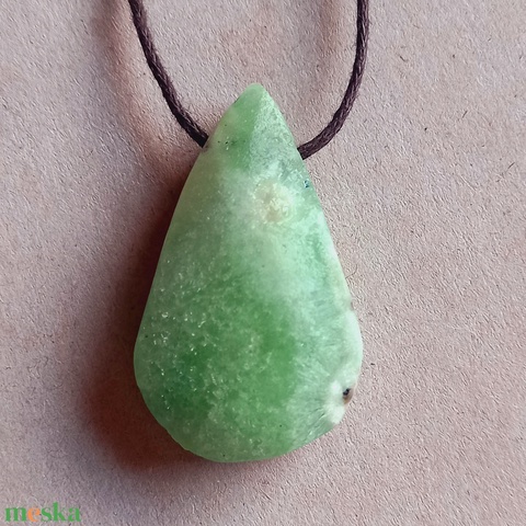 Eredeti natúr gyönyörű zöld kristályos Smithsonit medál átfúrva és pamutszálra fűzve. A medál saját készítés. Én vágom, csiszolom és polírozom. A medál mérete 39*21 mm. Natúr ásvány, enyhén csiszolva és polírozva hogy eredeti formáját megtartsa. Kézi munka. A medál készítése kizárólag két kezemmel történik semmilyen gépet nem használok hozzá (kizárólag a fúráshoz használok gépet).