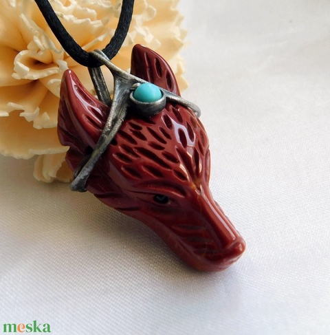 A medál Tiffany technikával készült jáspis farkasfej, türkinit, réz és ólommentes, ezüsttartalmú ón felhasználásával. A díszítés szintén saját készítésű, nem tartalmaz gyári elemeket. A fémrészt óezüstre patináztam és lelakkoztam, hogy sokáig szép maradjon.