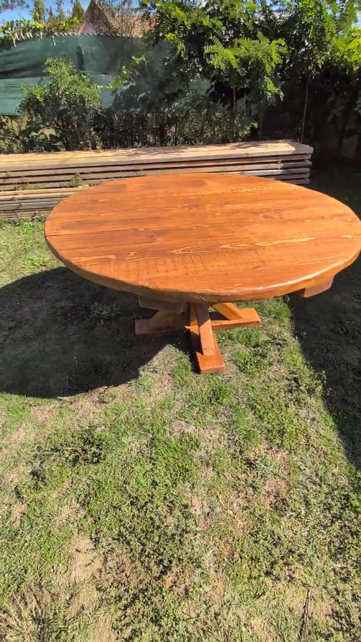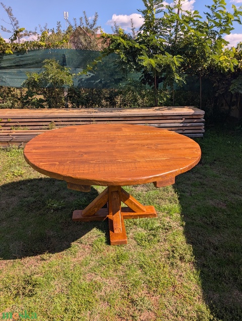 Rusztikus, kültéri, kerek étkező asztal, tömörfa kerti ebédlőasztal fenyőből, barna színben, 160 cm átmérővel