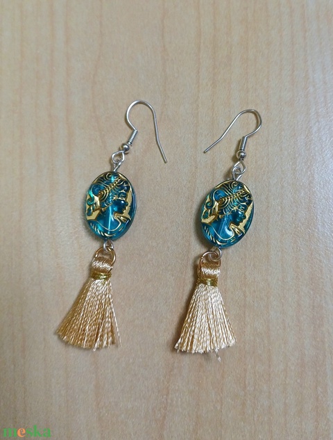 Türkiz-arany bojtos fülbevaló női fejjel