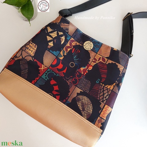 Afrikai mintás Kézműves Válltáska – Női Arany Aljú Egyedi Darab ( Valódi bőr részekkel )