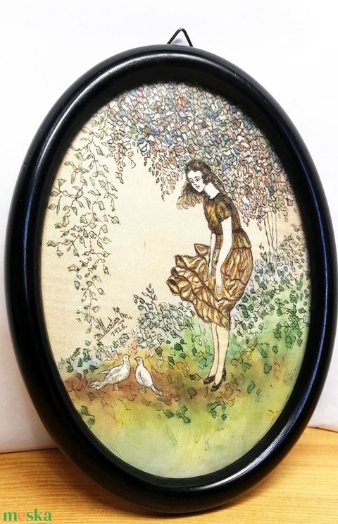 Antik selyem festmény. Galambokat etető hölgy. Szignálva
