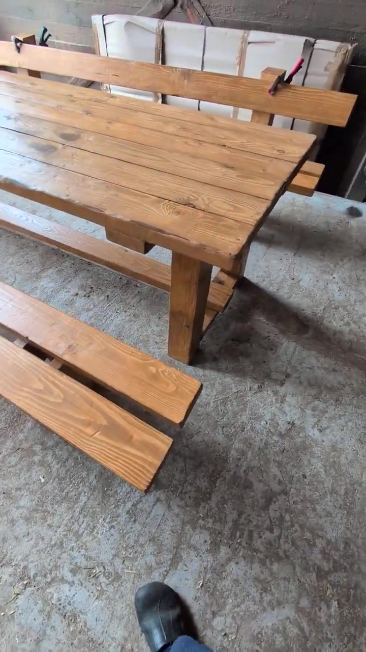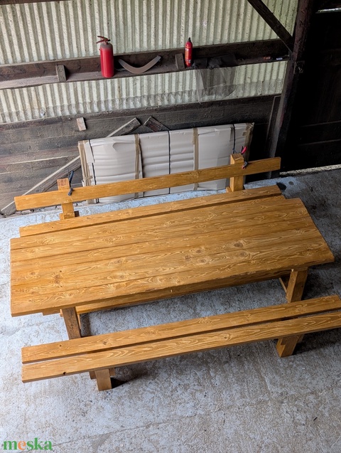 Rusztikus kültéri étkező asztal, tömörfa kerti étkező garnitúra, dió színben, 3m