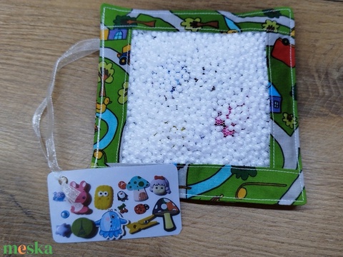 - Anyaga: pamutvászon, hungarocell, műanyag játékok, gyöngy, fa gombok