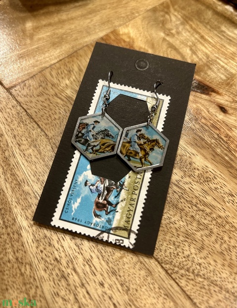 Régi vintage bélyeg fülbevaló ló lovas magyar