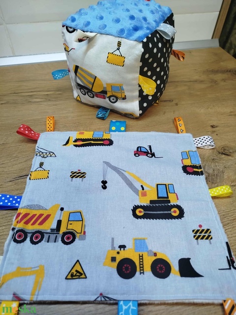munkagép mintás címkerongyi+puha csörgő címkekocka szett