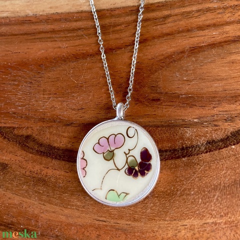 Zsolnay mentett darabok - porcelán nyaklánc - virágos medál nemesacél lánccal