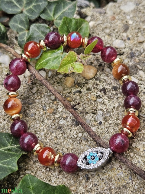 gumis damil, hematit gyöngyök, gránát gyöngyök, tigrisszem gyöngyök, karneol gyöngyök, védelmező szem fém köztes