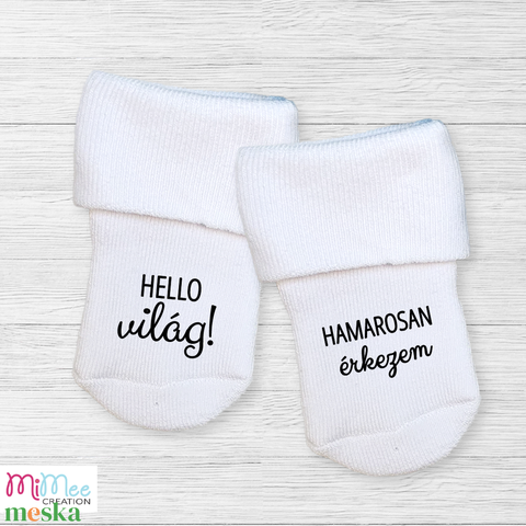 "Hello világ! Hamarosan érkezem" baba bejelentő zokni, babazokni