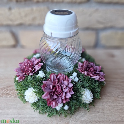 napelemes mécses, mű tujás koszorú, selyemvirág