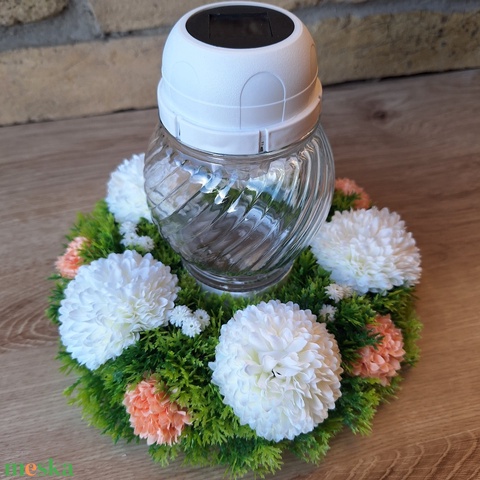 napelemes mécses, mű tujás koszorú, selyemvirág
