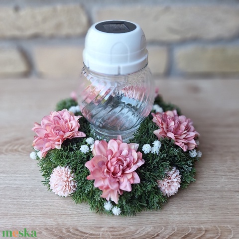 napelemes mécses, mű tujás koszorú, selyemvirág