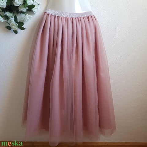 Púder színű tüll szoknya, 5 rétegű midi alsószoknya csillogós derékkal