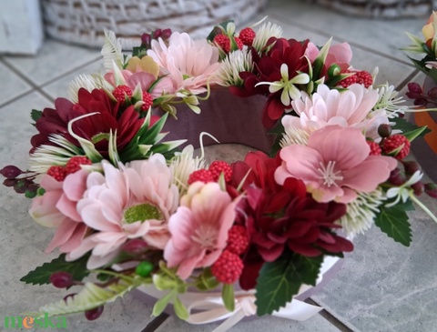 - Anyaga: szalmaalap, ragasztó, termések, masni, selyemvirágok