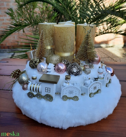 - Anyaga: műszörme, fa, selyemszalag, gyertya, fém gyertyatű, rózsaszín, ezüst, kisvonat, körhinta