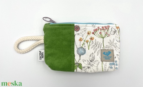 Kis, vadvirágos pipere táska fűzöld korddal, kék-szürke cipzárral