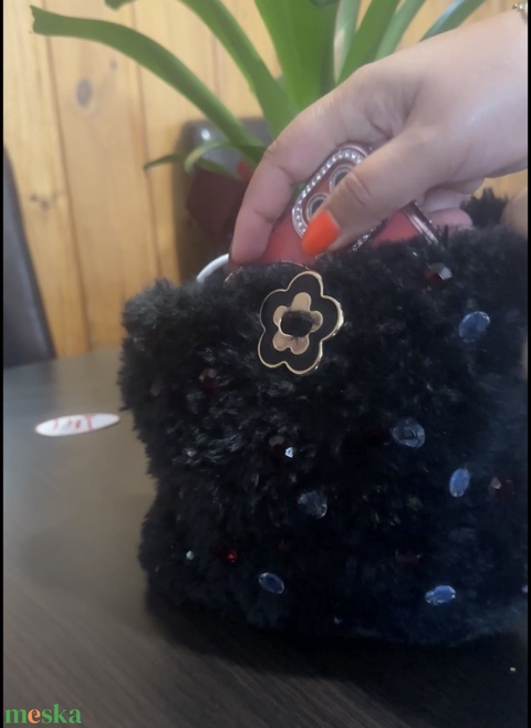 Ez a kézzel horgolt, teljesen egyedi tervezésű táska igazán különleges kiegészítő, amely nemcsak mutatós, hanem praktikus is. A puha, fekete horgolt alapot gyöngyök és díszek teszik különlegessé, a virág alakú csatt pedig nőies, egyedi részlet.