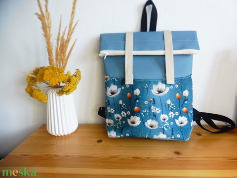 Fehér virág mintás kék roll top hátizsák