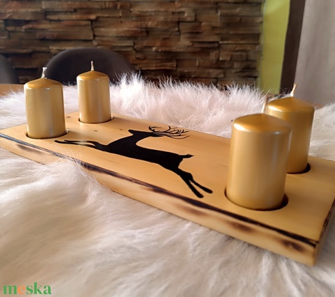 Szarvas sziluettel díszített,fából készült asztali gyertyatartó