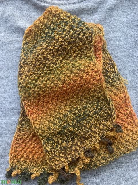 Sál Őszi erdő színeiben pompázó sárgás barnás narancsos melírozású gyapjú kézi kötésű sál